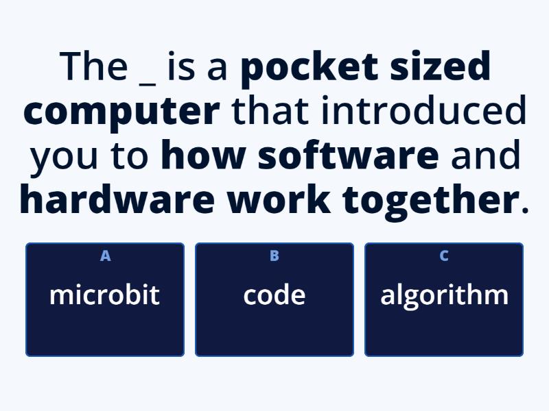 1) The _ is a pocket sized computer that introduced you to how software and hardware work together. a) microbit b) code c) algorithm 2) instructions written in a way a computer can understand a) microbit b) code c) hardware 3) a set of step-by-step instruction a) algorithm b) software c) LED (light emitting diode) 4) a physical device like a computer or microbit that is told what to do by computer programs (software) a) hardware b) software c) string 5) a set of programs used to perform a task, which is usually more complex than a single program a) hardware b) software c) string 6) a collection of letters, numbers, or symbols stored in a computer a) hardware b) software c) string 7) data sent from a computer such as information shown on the LED display a) loops b) string c) output 8) allow you to repeat sets of instructions without having to write them out multiple times a) loops b) string c) output 9) the microbit display is made of _ LEDs a) 10 b) 25 c) 50 10) a set of instructions written in code that performs a given task a) program b) LED (light emitting diode) c) output