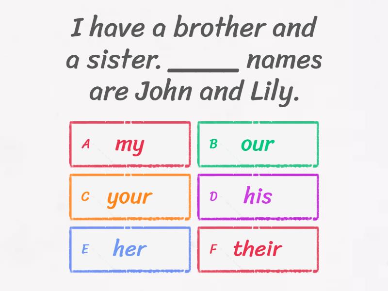 1) I have a brother and a sister. _____ names are John and Lily. a) my b) our c) your d) his e) her f) their 2) We have got a house. _____ house is big. a) my b) our c) your d) his e) her f) their 3) He has got a car. _____ car is new. a) my b) our c) your d) his e) her f) their 4) This is my grandmother. _____ name is Mary. a) my b) our c) your d) his e) her f) their 5) This is my brother. _____ name is Fred. a) my b) our c) your d) his e) her f) their 6) You have got a cat. What's _____ cat's name? a) my b) our c) your d) his e) her f) their 7) My name's Tony. And _____ sister's name is Ann. a) my b) our c) your d) his e) her f) their 8) My grandparents have got 2 cats. _____ cats are pretty. a) my b) our c) your d) his e) her f) their 9) This is my grandfather. _____ name's Jack. a) my b) our c) your d) his e) her f) their 10) This girl is my friend. _____ name is Susan. a) my b) our c) your d) his e) her f) their