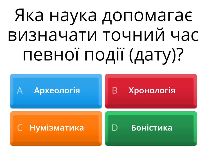1) Яка наука допомагає визначати точний час певної події (дату)? a) Археологія b) Хронологія c) Нумізматика d) Боністика 2) Який календар використовується у наш час? a) Новоюліанський b) Мусульманський c) Григоріанський d) Іудейський 3) Скільки днів у високосному році? a) 364 b) 365 c) 366 d) 367 4) Якою точкою відліку починається наша ера? a) Воскресіння Ісуса Христа b) Розпяття Ісуса Христа c) Народження Ісуса Христа d) Хрещення Ісуса Христа 5) У 1989 році урочисто святкували 500-річчя виникнення українського козацтва. Яким роком датується перша згадка про козаків у писемних джерелах? a) 1187 р. b) 1492 р. c) 1489 р. d) 1500 р. 6) У 988 році Володимир Великий хрестив Русь. Скільки років минуло (2024 р.)? a) 1033 b) 1034 c) 1035 d) 1036 7) Весь історичний час до народження Ісуса називають: a) час до нашої ери b) час нашої ери c) тисячоліття 8) Стародавні греки вели своє літочислення від: a) народження Ісуса Христа b) за династіями царів c) зі створення світу за Біблією d) за олімпіадами 9) Щоб уявити рух часу в історії, використовують a) «лінію часу» b) хронологічну таблицю c) сонячний календар d) місячний календар 10) Що з переліку не є одиницями вимірювання історичного часу? a) рік b) століття c) ера d) мить