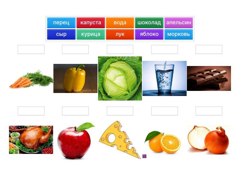курица, мясо, картошка, огурец, помидор, шоколад, сыр, масло, вода, банан, яблоко, апельсин, яйца, лук, капуста, перец, рыба, грибы, морковь,