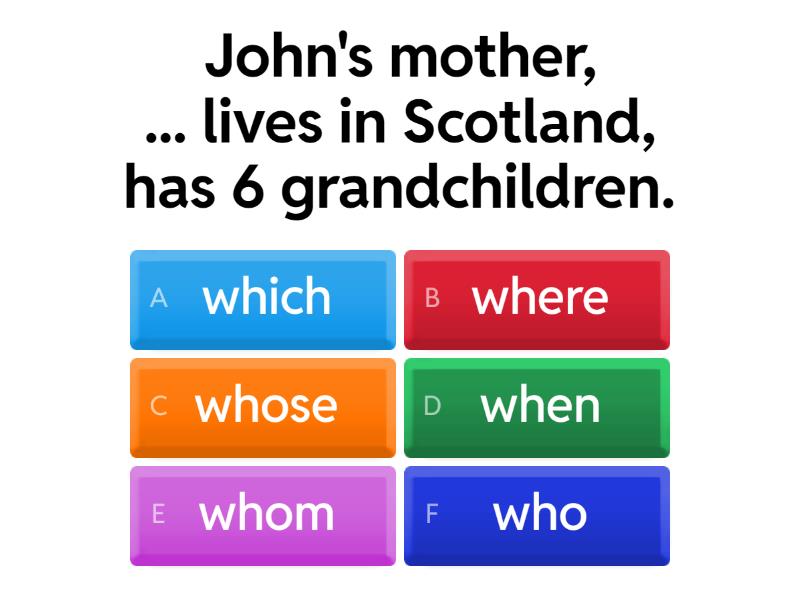 1) John's mother, ... lives in Scotland, has 6 grandchildren. a) which b) where c) whose d) when e) whom f) who 2) My friend Mark, ... went to the same school as me, has just written a best-selling novel. a) which b) where c) whose d) when e) whom f) who 3) I've just come back from London, ... John lives. a) which b) where c) whose d) when e) whom f) who 4) Yesterday I met a woman named Susan, ... husband works in London. a) which b) where c) whose d) when e) whom f) who 5) My grandmother, ... is dead now, came from the North of England. a) which b) where c) whose d) when e) whom f) who 6) Alfred Hitchcock , ... was born in Britain, worked for many years in Hollywood. a) which b) where c) whose d) when e) whom f) who 7) Mr. Jackson, ... son also goes to this school, will be attending the party next weekend. a) which b) where c) whose d) when e) whom f) who 8) Your eldest son, ... I happened to meet just now, has become a remarkably handsome boy. a) which b) where c) whose d) when e) whom f) who 9) I started at Microsoft in 2008, ... I worked until recently. a) which b) where c) whose d) when e) whom f) who 10) February, ... is my favorite month, lasts 28 days this year. a) which b) where c) whose d) when e) whom f) who 11) My next-door neighbor, ... children go to school with ours, has just bought a new car. a) which b) where c) whose d) when e) whom f) who 12) The hostel, ... we've stayed at several times, is simple but clean. a) which b) where c) whose d) when e) whom f) who 13) City Park, ... we used to go, has been closed down. a) which b) where c) whose d) when e) whom f) who 14) The Queen, ... loves skydiving, will be 93 in April. a) which b) where c) whose d) when e) whom f) who 15) My dog, ... is called Bobby, is a vegetarian. 😁 a) which b) where c) whose d) when e) whom f) who
