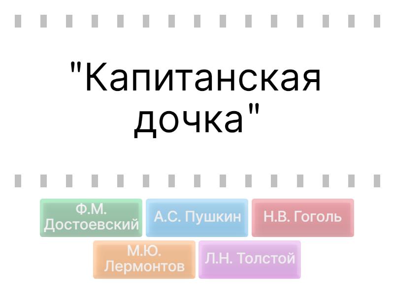 А.С. Пушкин - "Капитанская дочка", Н.В. Гоголь - "Мертвые души", М.Ю. Лермонтов  - "Герой нашего времени", Ф.М. Достоевский - "Преступление и наказание", Л.Н. Толстой - "Война и мир",
