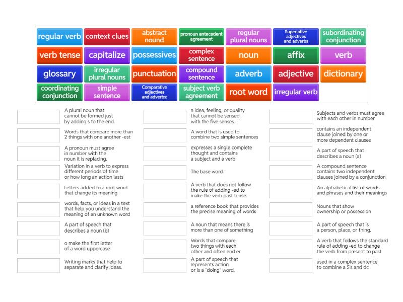 noun - A part of speech that is a person, place, or thing., verb - A part of speech that represents action or is a “doing” word., adjective - A part of speech that describes a noun (a), adverb - A part of speech that describes a noun (b), regular plural nouns - A noun that means there is more than one of something, irregular plural nouns - A plural noun that cannot be formed just by adding s to the end., abstract nound - n idea, feeling, or quality that cannot be sensed with the five senses., regular verb - A verb that follows the standard rule of adding -ed to change the verb from present to past , irregular verb - A verb that does not follow the rule of adding -ed to make the verb past tense., verb tense - Variation in a verb to express different periods of time or how long an action lasts, subject verb agreement - Subjects and verbs must agree with each other in number, pronoun antecedent agreement - A pronoun must agree in number with the noun it is replacing., Comparative adjectives and adverbs: - Words that compare two things with each other and often end er, Superlative adjectives and adverbs - Words that compare more than 2 things with one another -est , coordinating conjunction - A word that is used to combine two simple sentences, subordinating conjunction - used in a complex sentence to combine a S's and dc, simple sentence - expresses a single complete thought and contains a subject and a verb, compound sentence - A compound sentence contains two independent clauses joined by a conjunction, complex sentence - contains an independent clause joined by one or more dependent clauses, capitalize - o make the first letter of a word uppercase, punctuation - Writing marks that help to separate and clarify ideas., possessives - Nouns that show ownership or possession, context clues - words, facts, or ideas in a text that help you understand the meaning of an unknown word, affix - Letters added to a root word that change its meaning, root word - The base word., dictionary - a reference book that provides the precise meaning of words, glossary - An alphabetical list of words and phrases and their meanings,
