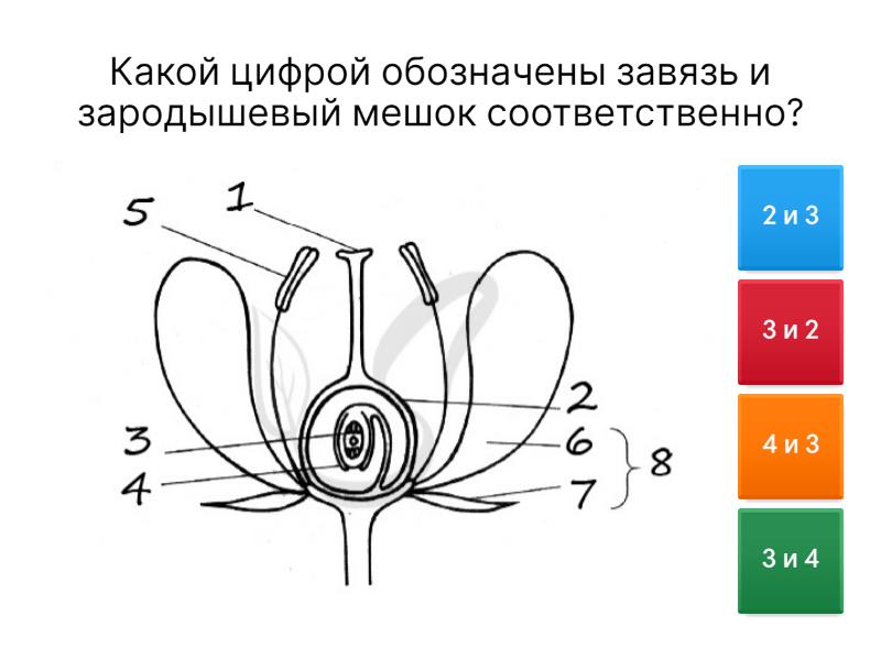 1) Какой цифрой обозначены завязь и зародышевый мешок соответственно? a) 2 и 3 b) 3 и 2 c) 4 и 3 d) 3 и 4 2) Какой цифрой обозначена часть цветка, в которой образуется мужской гаметофит? a) 1 b) 2 c) 3 d) 4 e) 5 f) 6 3) Двойной околоцветник состоит из: a) тычинок и пестика b) чашечки и венчика c) тычинок и венчика d) венчика и пестика 4) В какой части цветка происходит двойное оплодотворение? a) в пыльнике тычинки b) на рыльце пестика c) в столбике пестика d) в семязачатке завязи пестика 5) В какой части цветка происходит прорастание пыльцевого зерна? a) пыльник тычинки b) завязь пестика c) рыльце пестика d) тычиночная нить тычинки 6) Рассмотрите рисунок и определите, к каким растениям относится тополь. a) однодомное b) двудомное 7) Кукуруза - однодомное растение, это значит, что початки и метёлки находятся на... a) одном растении b) разных растениях 8) Какое соцветие имеет подорожник? a) 1 b) 2 c) 3 d) 4 9) Какое соцветие имеют подсолнечник, василёк и ромашка? a) 1 b) 2 c) 3 d) 4 e) 5 f) 6 10) В каком соцветии от главной оси отходят отдельные колоски с сидячими цветками? a) простая кисть b) метелка c) простой колос d) сложный колос e) щиток f) сложный зонтик 11) Какой тип соцветия характерен для ландыша и черемухи? a) кисть b) метелка c) простой колос d) простой зонтик 12) Какие признаки характерны для ветроопыляемых растений? a) обычно растут группами, образуя заросли или рощи b) цветки имеют яркую окраску венчика c) цветки с редуцированным околоцветником d) цветки с крупными пушистыми рыльцами пестика e) наличие в цветках нектара f) цветение до появления листьев 13) Под каким номером изображена часть цветка, из которой образуется плод? a) 1 b) 2 c) 3 d) 4 e) 5 f) 6 14) Из чего образуется семя? a) из завязи пестика b) из зародышевого мешка c) из семязачатка завязи пестика d) из пыльцевого зерна 15) Для каких растений характерен плод зерновка, а для каких -семянка? a) зерновка - Сложноцветные, семянка - Злаковые b) зерновка - Злаковые, семянка - Крестоцветные c) зерновка - Злаковые, семянка - Сложноцветные d) зерновка - Бобовые, семянка - Сложноцветные 16) Под какой цифрой изображена центральная клетка зародышевого мешка на рисунке? a) 1 b) 2 c) 3 d) 4 e) 5 f) 6 17) Под какой цифрой обозначена структура, которая формируется из стенки завязи? a) 1 b) 2 c) 3 d) 4 e) 5 18) Какой цифрой обозначен плод, характерный для подсолнечника, астры, одуванчика? a) 1 b) 2 c) 3 d) 4 19) Чем боб отличается от стручка? a) у боба семена расположены на створках b) у боба семена расположены на перегородке между створками 20) Чем зерновка отличается от семянки? a) у зерновки околоплодник не срастается с семенной кожурой b) у зерновки околоплодник срастается с семенной кожурой 21) Какая структура на рисунке формирует стержневую корневую систему? a) 1 b) 2 c) 3 d) 4 e) 5 f) 6 22) Какой цифрой обозначен структура на рис. А, которая отвечает за запасание питательных веществ? a) 1 b) 2 c) 3 23) У всех ли растений есть эндосперм? a) да, у всех b) нет, не у всех 24) В семени фасоли питательные вещества запасаются в... a) зародышевом стебельке b) семядолях c) зародышевом корешке d) семенной кожуре 25) Какие факторы обязательно нужны для прорастания семян у всех растений? a) тепло b) наличие воды c) наличие света d) наличие кислорода e) наличие углекислого газа f) запас питательных веществ
