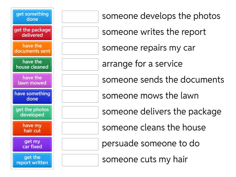 have something done - arrange for a service, get something done - persuade someone to do, have my hair cut - someone cuts my hair, get my car fixed - someone repairs my car, have the house cleaned - someone cleans the house, get the report written - someone writes the report, have the documents sent - someone sends the documents, get the photos developed - someone develops the photos, have the lawn mowed - someone mows the lawn, get the package delivered - someone delivers the package,