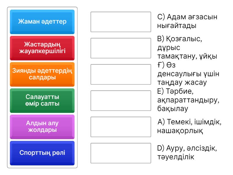 Салауатты өмір салты - В) Қозғалыс, дұрыс тамақтану, ұйқы, Жаман әдеттер - А) Темекі, ішімдік, нашақорлық, Спорттың рөлі - С) Адам ағзасын нығайтады, Зиянды әдеттердің салдары - D) Ауру, әлсіздік, тәуелділік, Алдын алу жолдары - Е) Тәрбие, ақпараттандыру, бақылау, Жастардың жауапкершілігі - Ғ) Өз денсаулығы үшін таңдау жасау,