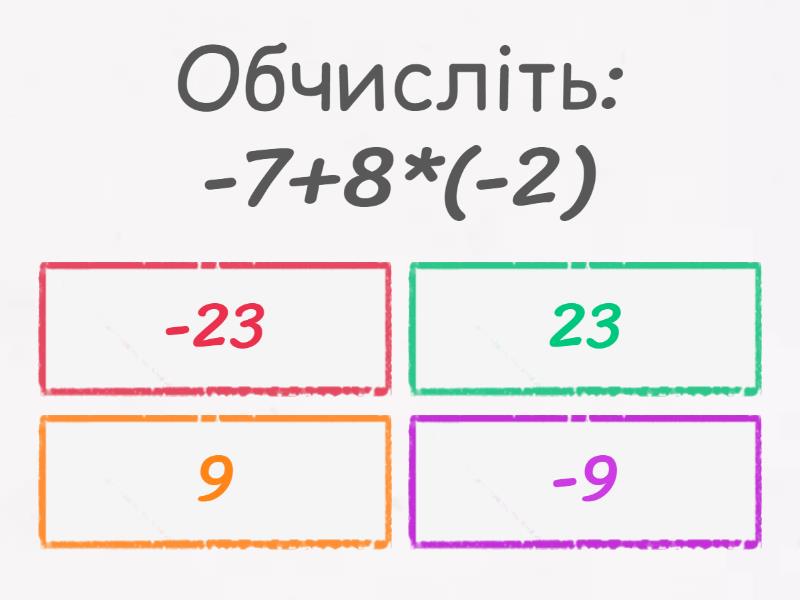 1) Обчисліть: -7+8*(-2) a) -23 b) 23 c) 9 d) -9 2) Заокругліть до сотих 7,8912 a) 7,9 b) 7,89 c) 7,90 d) 7,100 e) 700 3) Яке з чисел націло ділиться на 3? a) 124 b) 113 c) 671 d) 111 4) Обчислити a) Не знаю як b) 16/55 c) 5,5 d) 1/3 5) Вкажіть тип числа (-√121) a) Ціле b) Ірраціональне c) Натуральне d) Дробове 6) Знайдіть 2/3 від 15 a) 24,5 b) 10 c) 15 d) 15 цілих 2/3