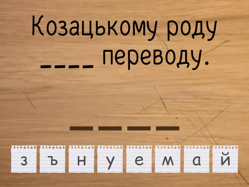 бідою - Козак з _____, як риба з водою., коня - Без ____ немає й козака., шабля - Береженого Бог береже, а козака – _____, нема - Козацькому роду ____ переводу., три - Де два козаки, там ___ гетьмани., враже - Скажи, _____ , як козак каже., вода - Хліб та ____ — то козацька їда., воля - Степ та ____ — козацька доля., тучі - Козак не боїться ні ____ , ні грому., правду - Дух козацький живе в серцях тих , хто бореться за ______ .,