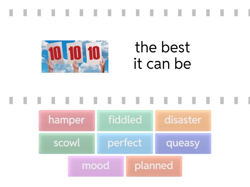 perfect - the best it can be, hamper - a basket used to hold dirty clothes, disaster - an event that goes horribly wrong, scowl - an angry frown, mood - the way you are feeling, queasy - your stomach hurts and you feel sick, fiddled - kept touching or playing with something, planned - decided ahead of time how you would do something,
