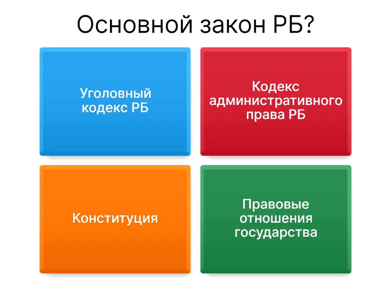 1) Основной закон РБ? a) Уголовный кодекс РБ b) Кодекс административного права РБ c) Конституция d) Правовые отношения государства 2) К какому из приведённых вариантов относится статья 24? a) Право на неприкосновенность b) Право на свободу совести c) Право на справедливый суд d) Право на жизнь e) добровольный брак f) право на защиту чести и достоинства 3) Какая Форма Правления в РБ a) абсолютная монархия b) тоталитаризм c) олигархия d) анархия e) демократия f) авторитаризм 4) Что из ниже перечисленного является социально-экономическим правом? a) право на труд b) право на свободу объединений  c) право на отдых d) право на собственность e) право на социальное обеспечение f) право на жизнь 5) Какие права относятся к политическому праву и свободе? a) свободна собраний, митингом и уличных шествий  b) свобода слова c) право избирать и быть избранным d) право на жилище 6) Что относится к системе гос. власти в РБ  a) Законодательство b) Социальные отношения c) Судебная d) правовые отношения e) исполнительная f) Отношения народа к власти 7) К правовому статусу гражданина относится? a) гражданские права  b) ЛИЧНЫЕ предпочтения и убеждения c) обязанности гражданина d) семейные отношения e) социальный статус f) экономические права 8) что входит в государство РБ? a) культура и язык b) население c) территория d) государственные органы e) частные организации f) иностранные государства 9) Что из ниже перечисленного относится к унитарному государству? a) федеративные структуры b) многоуравненная система власти c) разделение на независимые государства d) единая форма правления e) централизованное управление f) местные органы власти 10) Что относится к Законодательной системе гос власти в РБ? a) отсутствие независимого суда  b) прямое влияние президента c) палата представителей d) совет Республик e) инициальтва законодательства f) отсутствие реальной многопартийности 11) Что из нижеперечисленного относится к Судебной гос. власти в РБ a) структура судебной системы b) невозможность обжалования некоторых решений c) отграниченный доступ к правосудию d) право на защиту