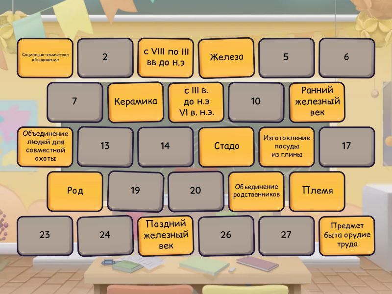 Железа - Предмет быта орудие труда, Ранний железный век - c VIII по III вв до н.э, Поздний железный век - c III в. до н.э VI в. н.э., Стадо - Объединение людей для совместной охоты , Род - Объединение родственников , Племя - Социально-этническое объединение , Керамика - Изготовление посуды из глины , Анимизм - Вера в существование души и духов, Тотемизм - Вера в душ животных, Петроглиф - Рисунки нанесенные на камни, Австролопитек - 2,5 млн лет назад, Питекантроп - 1,5 млн лет назад-200 тыс лет назад, Неандерталец - 100-35 тыс лет до н.э, Кроманьонец - 40-35 тыс лет до н.э,