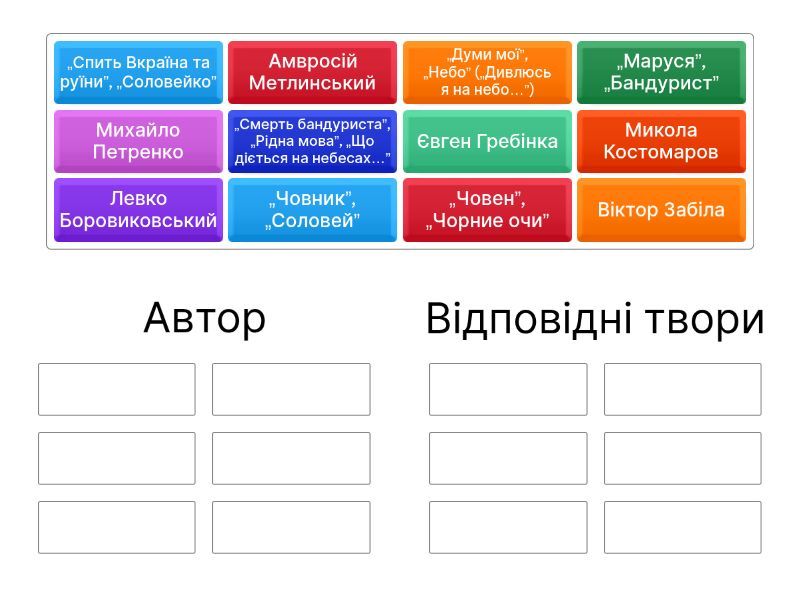 Автор: Євген Гребінка, Левко Боровиковський, Віктор Забіла, Михайло Петренко, Амвросій Метлинський, Микола Костомаров, Відповідні твори: „Човен”, „Чорние очи”, „Маруся”, „Бандурист”, „Човник”, „Соловей”, „Думи мої”, „Небо” („Дивлюсь я на небо…”), „Смерть бандуриста”, „Рідна мова”, „Що діється на небесах…”, „Спить Вкраїна та руїни”, „Соловейко”,