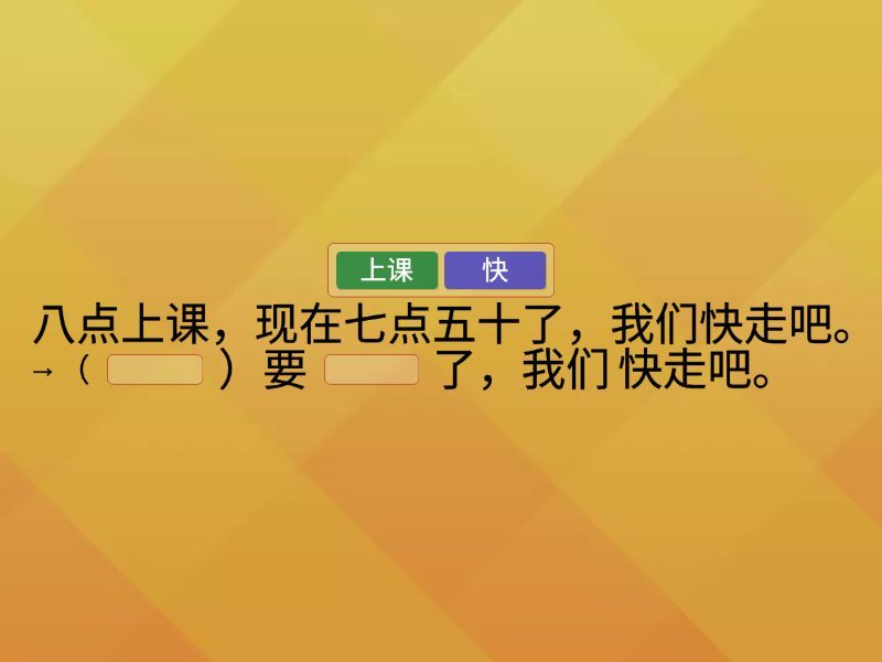 八点上课,现在七点五十了,我们快走吧。 →( ____ )要 ____ 了,我们 快走吧。 你再等等,他很快就来。 → 你再等等,他 ____ ____ ____。 李成日明天回国,我们去看看他吧。 → 李成日明天 ____ ____ ____ ____,我们去看看他吧。 饭很快就做好,你们在这儿吃饭吧。 → 饭很快 ____ ____ 做好 ____,你们在这儿吃饭吧。