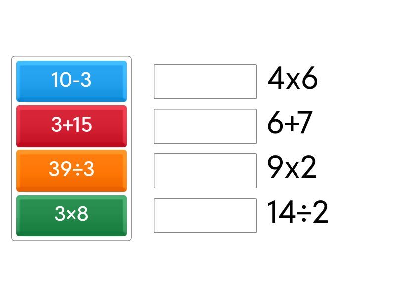 3+15 - 9x2 , 10-3 - 14÷2, 3×8 - 4x6, 39÷3 - 6+7,