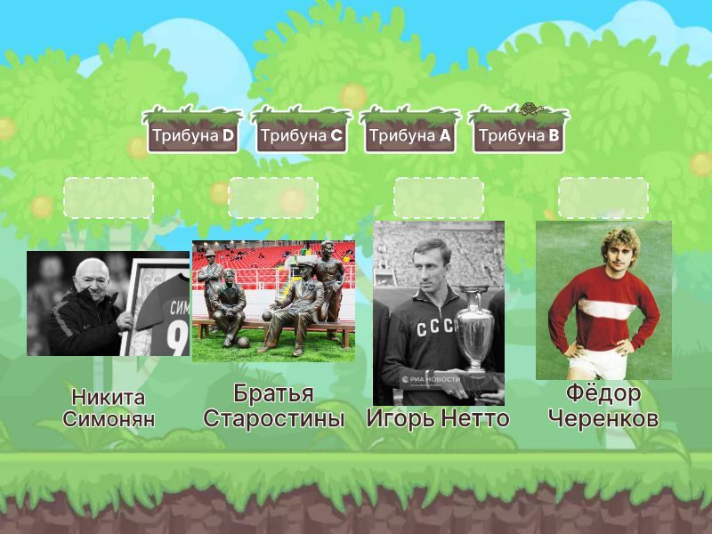 Трибуна A - Никита Симонян, Трибуна B - Братья Старостины, Трибуна C - Игорь Нетто, Трибуна D - Фёдор Черенков,