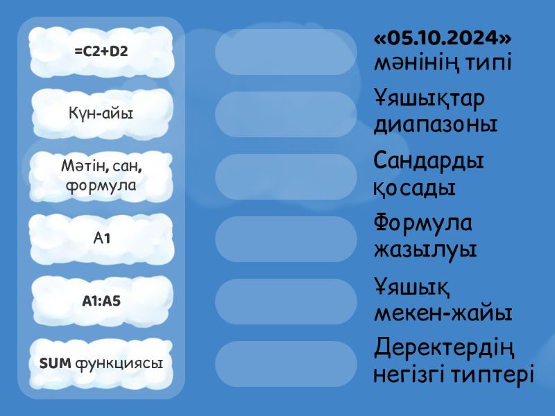 А1 - Ұяшық мекен-жайы, =C2+D2 - Формула жазылуы, A1:A5 - Ұяшықтар диапазоны, Мәтін, сан, формула - Деректердің негізгі типтері, Күн-айы - «05.10.2024» мәнінің типі, SUM функциясы - Сандарды қосады,