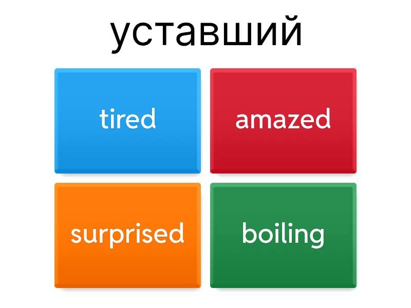 1) уставший a) tired b) amazed c) surprised d) boiling 2) изумленный a) surprised b) delighted c) happy d) amazed 3) удивленный a) exhausted b) surprised c) boiling d) dirty 4) кипящий a) boiling b) hungry c) happy d) cold 5) большой a) hot b) huge c) big d) tiny 6) восхищенный a) delighted b) fifthy c) surprised d) amazed 7) холодный a) hot b) freezing c) cold d) filthy 8) измученный a) furious b) terrified c) surprised d) exhausted 9) грязный a) fascinating b) afraid c) angry d) dirty 10) мерзкий, отвратительный a) filthy b) dirty c) cold d) terrified 11) забавный, смешной a) happy b) positive c) funny d) sure 12) ледяной a) freezing b) exhausted c) terrified d) cold 13) счастливый, веселый a) positive b) happy c) funny d) sure 14) яростный a) terrified b) interesting c) afraid d) furious 15) жаркий a) hot b) small c) delighted d) big 16) очаровательный a) hilarious b) fascinating c) funny d) amazed 17) голодный a) starving b) boiling c) hungry d) filthy 18) шумный a) fascinating b) surprised c) positive d) hilarious 19) интересный a) interesting b) funny c) tired d) delighted 20) огромный a) angry b) huge c) dirty d) hot 21) маленький a) small b) tiny c) exhausted d) hot 22) положительный a) freezing b) boiling c) hungry d) positive 23) уверенный a) hungry b) sure c) cold d) terrified 24) умирающий с голода a) starving b) hungry c) terrified d) interesting 25) испуганный, боящийся a) fascinating b) big c) afraid d) exhausted 26) запуганный a) afraid b) terrified c) huge d) hungry 27) злой a) tiny b) furious c) angry d) hilarious 28) крошечный a) tiny b) big c) small d) sure