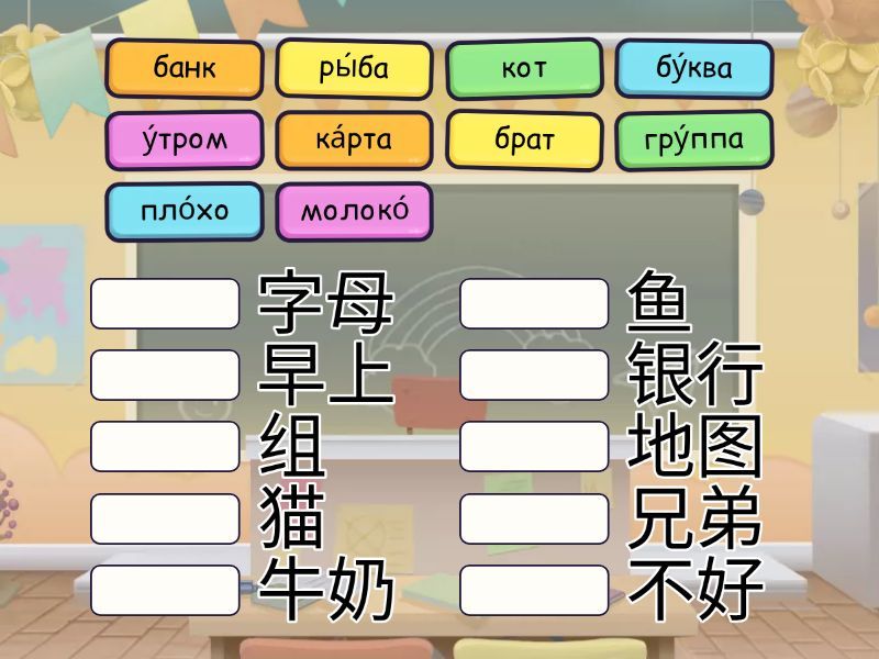парк - 公园, брат - 兄弟, торт - 蛋糕, ры́ба - 鱼, ка́рта - 地图, гру́ппа - 组, у́тром - 早上, уро́к - 课, подру́га - 女朋友, как - 如何, бу́ква - 字母, окно́ - 窗户, ко́мната - 房间, молоко́ - 牛奶, кот - 猫, кто - 谁, банк - 银行, пло́хо - 不好, мно́го - 很多, вода́ - 水,