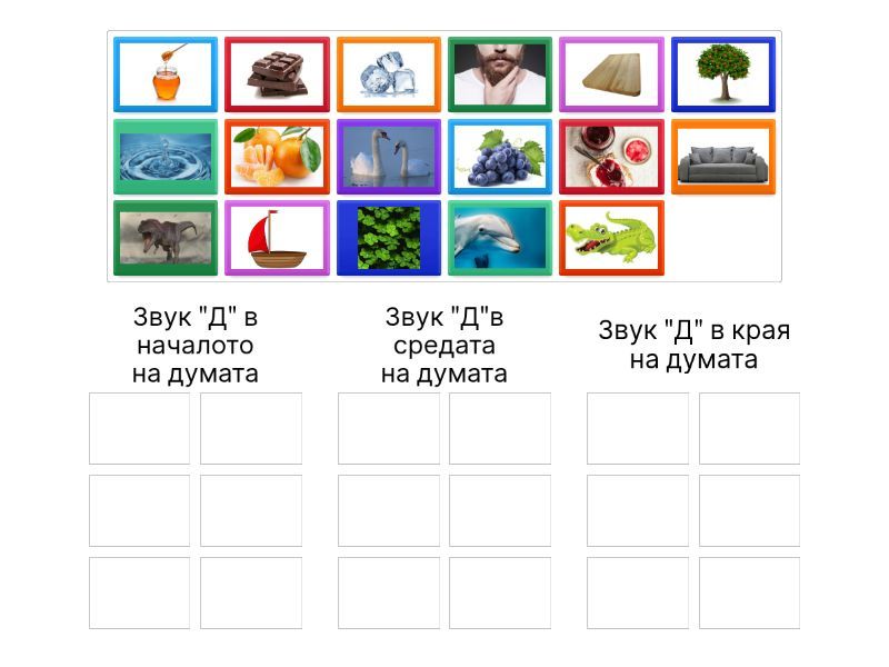 Звук "Д" в началото на думата: , , , , , , Звук "Д"в средата на думата: , , , , , , Звук "Д" в края на думата: , , , , ,