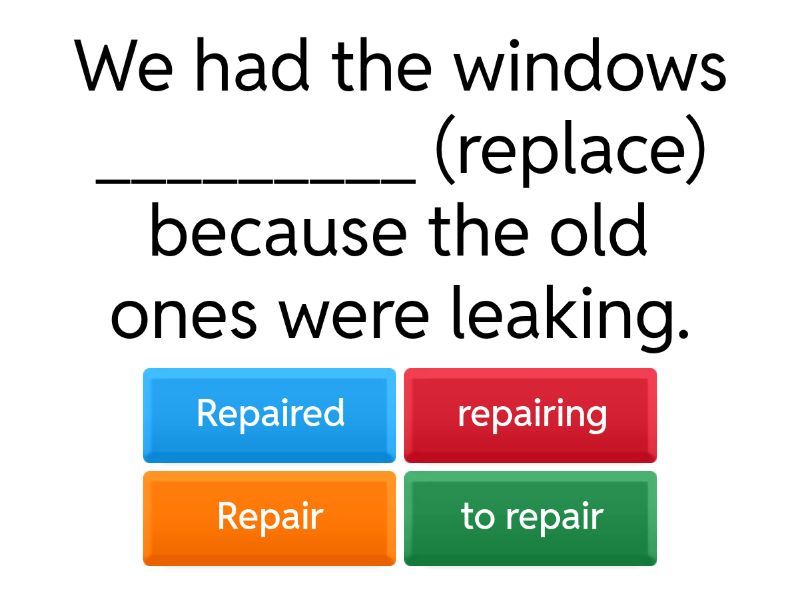 1) We had the windows _________ (replace) because the old ones were leaking. a) Repaired b) repairing c) Repair d) to repair 2) Her coach recommended that she _________ (train) at least four times a week. a) trained b) training c) to train d) train 3) Could you remind me _________ (send) that report this afternoon? a) to send b) send c) sending d) sent 4) Grading so many essays has me _________ (lose) my mind. a) lose b) to lose c) losing d) lost 5) The manager asked that the employees not _________ (bring) their phones to the meeting. a) bringing b) to bring c) bring d) brought 6) He was told _________ (wait) in the lobby until his name was called. a) waiting b) waited c) wait d) to wait 7) Emma needs help _________ (set up) her new laptop. a) set up b) to set up c) setting up d) set upped 8) Please show the technician where _________ (plug in) the device. a) plugging in b) plug in c) to plug in d) plugged in 9) All the noise from the construction has me _________ (think) about moving. a) tought b) think c) thinking d) to think 10) They got their car _________ (clean) right before their road trip. a) cleaned b) cleaning c) to clean d) clean