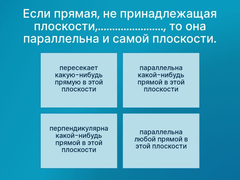 1) Если прямая, не принадлежащая плоскости,......................., то она параллельна и самой плоскости. a) пересекает какую-нибудь прямую в этой плоскости b) параллельна какой-нибудь прямой в этой плоскости c) перпендикулярна какой-нибудь прямой в этой плоскости d) параллельна любой прямой в этой плоскости 2) Верно ли, что если плоскость проходит через данную прямую, параллельную другой плоскости, и пересекает эту плоскость, то линия пересечения плоскостей параллельна данной прямой. a) Верно b) Неверно 3) Средняя линия треугольника..............основанию, средняя линия трапеции .....................основаниям a) параллельна, перпендикулярна b) перпендикулярна, параллельна c) параллельна, параллельна d) перпендикулярна, перпендикулярна 4) Отношение площадей подобных фигур равно (k - коэффициент подобия) a) k b) k2 c) k3 d) k4 5) Отношение объемов подобных тел равно (k - коэффициент подобия) a) k b) k2 c) k3 d) k4 6) Верно ли, что правильная четырёхугольная пирамида — это пирамида, основанием которой является квадрат? a) Верно b) Неверно 7) Центром параллелограмма, квадрата, прямоугольника является a) точка пересечения диагоналей b) какая-то из заданных точек по задаче c) середина стороны d) нет точного ответа