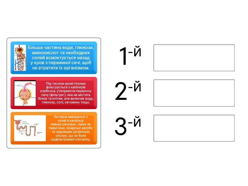 Під тиском крові плазма фільтрується з капілярів клубочка, утворюючи первинну сечу (фільтрат), яка не містить білків та клітин, але включає воду, глюкозу, солі, сечовину тощо., Більша частина води, глюкози, амінокислот та необхідних солей всмоктується назад у кров з первинної сечі, щоб не втратити їх організмом., Активне виведення з крові в канальці певних речовин, таких як певні іони, лікарські засоби та надлишки органічних сполук, що не були відфільтровані спочатку..