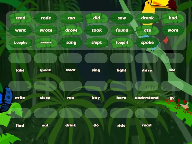 went - go, bought - buy, did - do, fought - fight, ran - run, understood - understand, sang - sing, ate - eat, drove - drive, drank - drink, wore - wear, saw - see, found - find, took - take, slept - sleep, had - have, spoke - speak, read - read, wrote - write, rode - ride,
