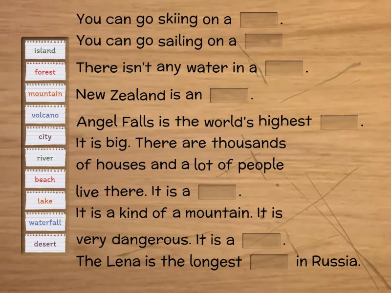 You can go skiing on a ____. You can go sailing on a ____ There isn't any water in a ____. New Zealand is an ____. Angel Falls is the world's highest ____. It is big. There are thousands of houses and a lot of people live there. It is a ____. It is a kind of a mountain. It is very dangerous. It is a ____. The Lena is the longest ____ in Russia.