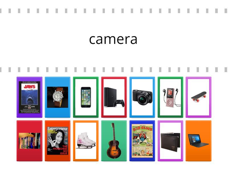 camera, games console, laptop, MP3 Player, wallet, comics, guitar, magazine, poster, watch, DVD, ice skates, mobile phone, skateboard,