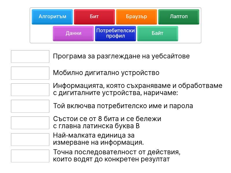 Данни - Информацията, която съхраняваме и обработваме с дигиталните устройства, наричаме:, Файл - Съвкупност от информация, организирана по определени правила., Папка - Съхраняваме и подреждаме файловете в , Събиране, съхранение, обработване и разпространение - Четирите основни дейности, които дигиталните устройства извършват с информацията., Бит - Най-малката единица за измерване на информация., Байт - Състои се от 8 бита и се бележи с главна латинска буква B, Входящи устройства - Мишка, клавиатура, микрофон, камера, Изходящи устройства - Монитор, принтер, слушалки, колони, Команден блок за разклонение - Според това дали дадено условие е вярно или не, програмата се изпълнява по различен начин, Алгоритъм - Точна последователност от действия, които водят до конкретен резултат, Потребители - Хората, които използват информация в сайтовете., Дигитални устройства - Стационарни и мобилни , Лаптоп - Мобилно дигитално устройство, Браузър - Програма за разглеждане на уебсайтове, Уебсайт - Използва се за организиране на информацията в Интернет, Потребителски профил - Той включва потребителско име и парола, Аватар - Изображение с измислен образ, с което се представяме в Интернет, Дигитална идентичност - Използва се само при работа във виртуална среда., Процесор - Мозъкът на компютъра, Парола - Комбинация от букви, цифри и специални знаци, която служи за защита на потребителски профил., Дигит - Цифра,