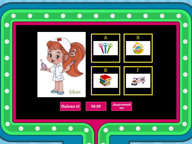 1) Будівельник a) b) c) d) 2) Художник a) b) c) d) 3) Пожежник a) b) c) d) 4) Кухар a) b) c) d) 5) Вчитель a) b) c) d) 6) Поліцейський a) b) c) d)