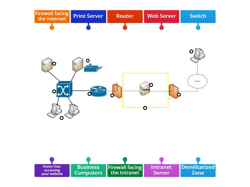Demilitarized Zone, Web Server, Firewall facing the Internet, Firewall facing the Intranet, Intranet Server, Print Server, Business Computers, Router, Home User accessing your website, Switch.