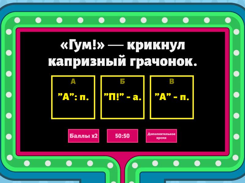 1) «Гум!» — крикнул капризный грачонок. a) "А": п. b) "П!" - а. c) "А" - п. 2) «Что это за птица с крыльями без перьев?" — спросил грачонок. a) "П?" - а. b) "А" - а. c) "П" - а. 3) Брат сказал: "Я хочу с тобой поехать". a) А: "П". b) П: "А". c) А: "П!" 4) Ещё накануне Дерсу говорил мне: "В этих местах бродит много тигров". a) А: "П"! b) А,- "П". c) А: "П". 5) "Славная погода завтра будет", - заметил я. a) "П", - п... b) "П", - а. c) "А", - а. 6) Петька встретил меня ворчаньем: «Ты что так долго?» a) А: "П". b) А: "П!" c) А: "П?" 7) «А как ее звать?» – спрашивают ребята. a) "П?" а. b) "П?" - а. c) "П"? - а. 8) Ребята после этого вовсе на голубую змейку осердились: «Не будем о ней говорить!» a) "П!" - а. b) "П", - а. c) А: "П!"