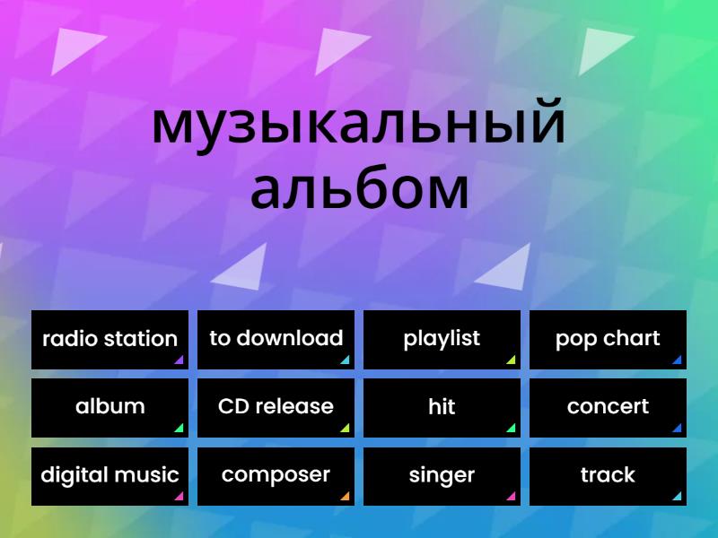album - музыкальный альбом, digital music - цифровая музыка , pop chart - популярный чарт, CD release - выпуск диска, to download - скачать, загрузить, radio station - радиостанция , composer - композитор , hit - хит, singer - певец, concert - концерт, playlist - плейлист, track - музыкальная дорожка, «трэк»,