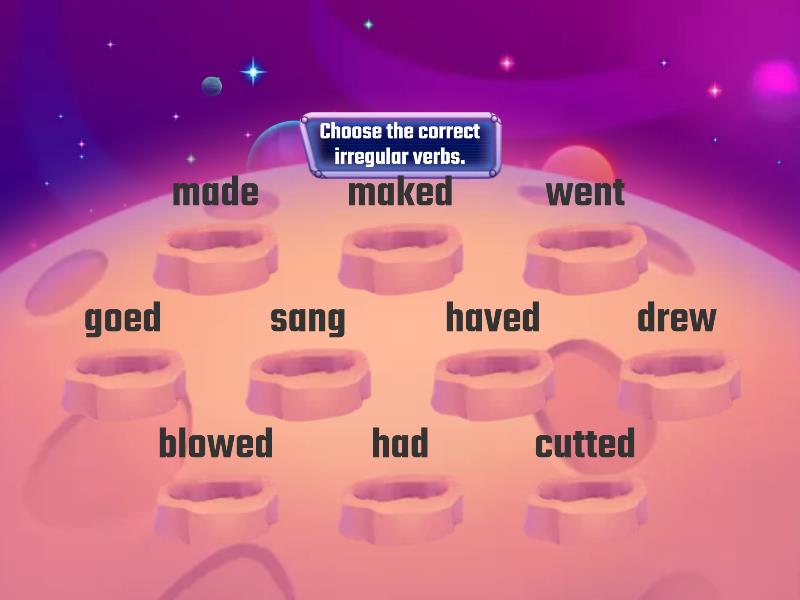 Correct: made, went, sang, drew, had, blew, drank, cut, took, gave, Incorrect: maked, goed, haved, blowed, cutted, drinked, gived,