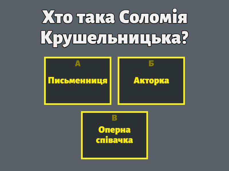 1) Хто така Соломія Крушельницька? a) Письменниця b) Акторка c) Оперна співачка 2) В якому році народилася Соломія Крушельницька? a) 1856 b) 1883 c) 1872 3) Ким був батько Соломії? a) священником b) гончарем c) водієм 4) В якій із консерваторій навчалася Соломія Крушельницька? a) Київська b) Одеська c) Львівська 5) В якій країні мріяла вчитися Крушельницька? a) Італії b) Китаї c) Польщі