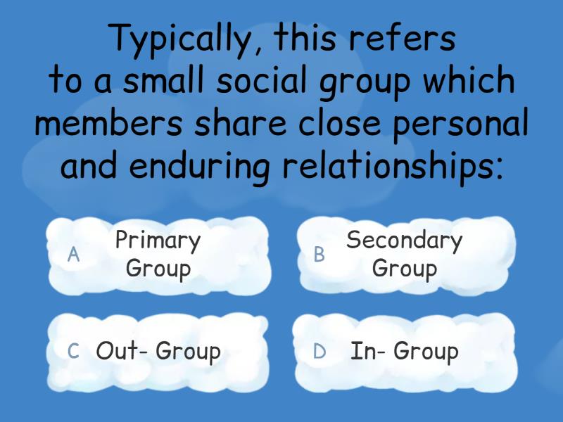 1) Typically, this refers to a small social group which members share close personal and enduring relationships: a) Primary Group b) Secondary Group c) Out- Group d) In- Group 2) We observed various groups of people with a certain degree of relationship. This can be small or large, mostly impersonal and usually short-term. a) Out- Group b) Primary Group c) Secondary Group d) In- Group 3) People are grouped according to certain manner. Which group is identified with each other based on common interests? a) Social Group b) In- Group c) Reference Group d) Primary Group 4) Because of certain characteristics of people, what groups in which individuals do not identify herself/himself? a) Reference Group b) Social Group c) In- Group d) Out- Group 5) Many social groups have shared various similarities in some particular way, which of the following is the true purpose of having a reference group? a) To win friends b) To serve as a guide to our behavior c) To identify cultural and behavioral norms d) To evaluate the behavior and culture of the people.