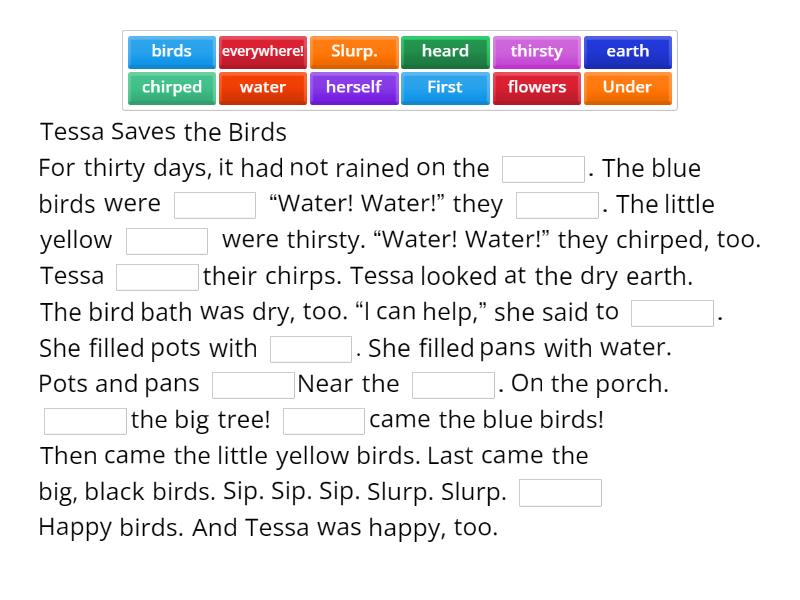 Tessa Saves the Birds For thirty days, it had not rained on the ____. The blue birds were ____ “Water! Water!” they ____. The little yellow ____ were thirsty. “Water! Water!” they chirped, too. Tessa ____their chirps. Tessa looked at the dry earth. The bird bath was dry, too. “I can help,” she said to ____. She filled pots with ____. She filled pans with water. Pots and pans ____Near the ____. On the porch. ____the big tree! ____came the blue birds! Then came the little yellow birds. Last came the big, black birds. Sip. Sip. Sip. Slurp. Slurp. ____ Happy birds. And Tessa was happy, too.