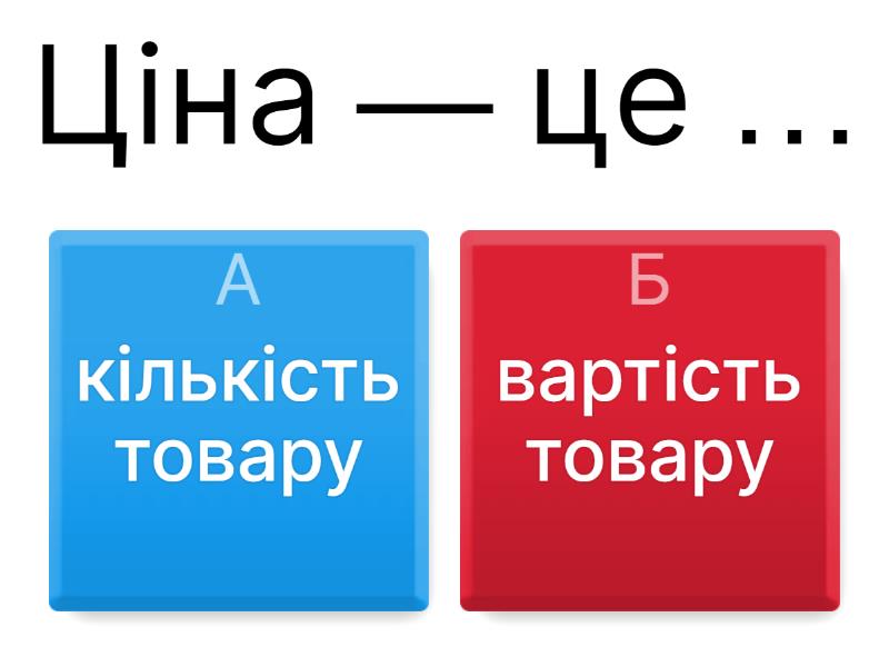 1) Ціна — це … a) кількість товару b) вартість товару 2) Вартість — це … a) вартість усієї покупки b) ціна однієї одиниці