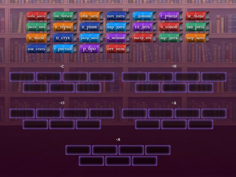 -е: р_бро, отт_пель, н_мецкий, зав_рять, затр_щать, побл_днеть, изв_стить, -и: ж_льцы, поч_нить, ош_баться, -о: н_чной, выстр_ить, г_ристый, г_рчица, -а: расск_зать, п_рник, с_довник, ч_совой, п_стух, -я: обв_зать, распр_мить, гл_деть, нар_дить, зар_дить, п_тёрка,