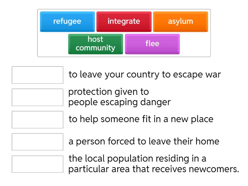 asylum - protection given to people escaping danger, integrate - to help someone fit in a new place, refugee - a person forced to leave their home, host community - the local population residing in a particular area that receives newcomers., flee - to leave your country to escape war,