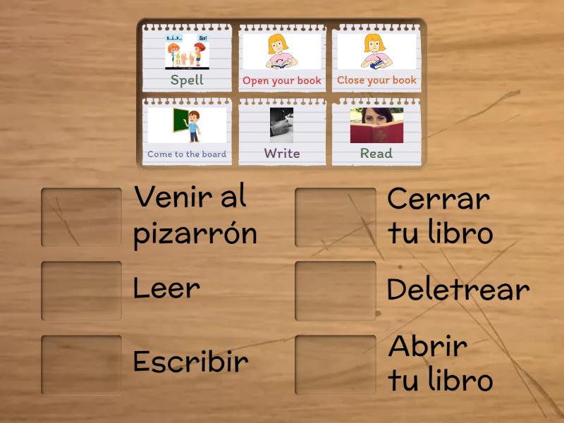 Read - Leer, Write - Escribir, Spell - Deletrear, Come to the board - Venir al pizarrón, Open your book - Abrir tu libro, Close your book - Cerrar tu libro,