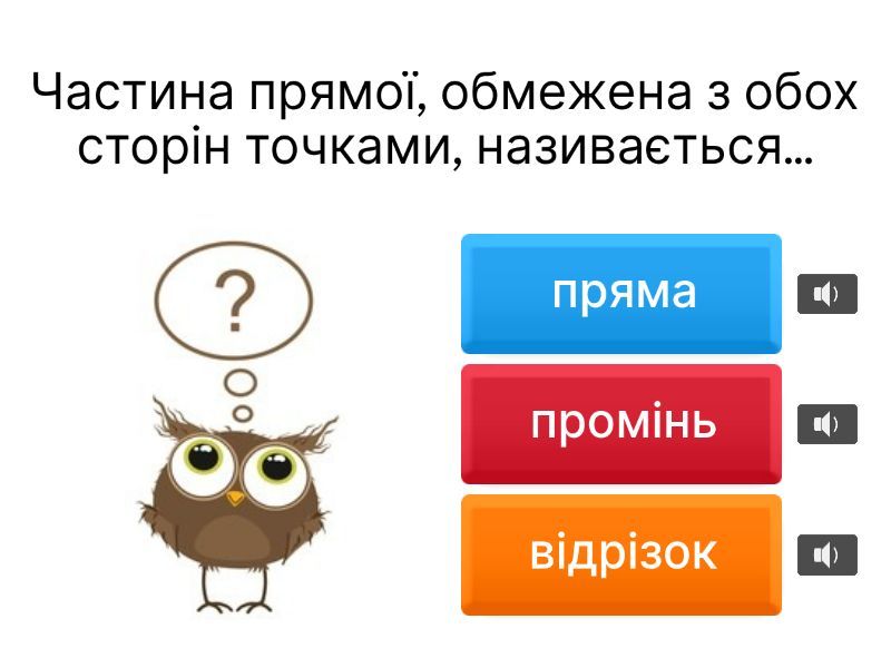 1) Частина прямої, обмежена з обох сторін точками, називається... a) пряма b) промінь c) відрізок 2) Частина прямої, обмежена тільки з однієї сорони точкою, називається... a) промінь b) відрізок c) кут 3) Лінія, що не має ні початку, ні кінця... a) промінь b) пряма c) кут 4) Ця лінія називається... a) відрізок b) пряма c) промінь 5) Ця лінія називається... a) відрізок b) пряма c) промінь