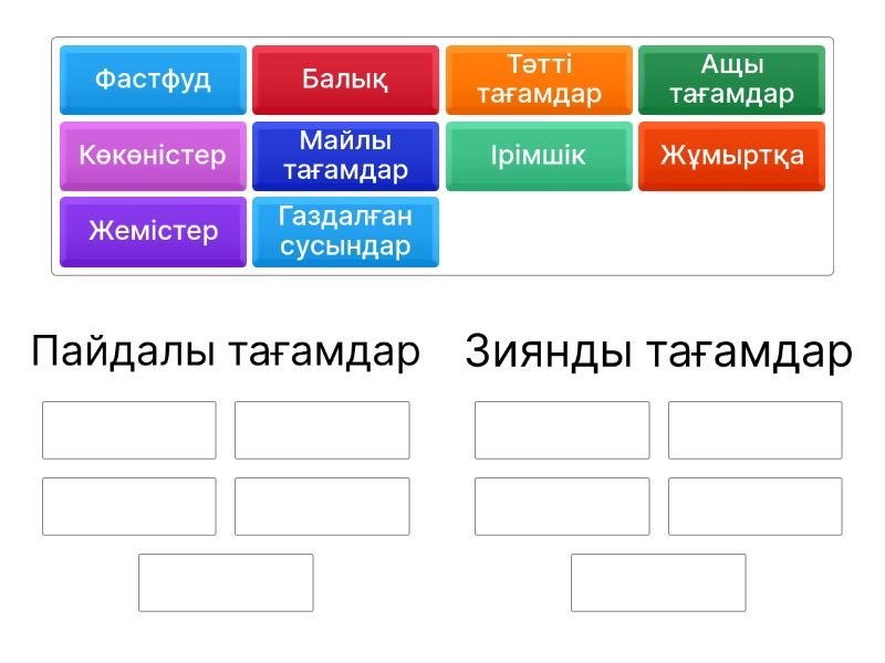 Пайдалы тағамдар: Жемістер, Жұмыртқа, Көкөністер, Балық, Ірімшік, Зиянды тағамдар: Газдалған сусындар, Тәтті тағамдар, Фастфуд, Ащы тағамдар, Майлы тағамдар,