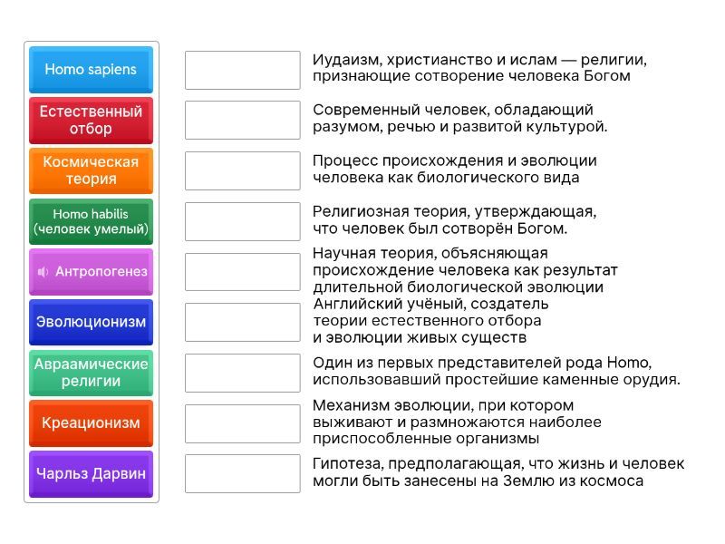 Антропогенез - Процесс происхождения и эволюции человека как биологического вида, Креационизм - Религиозная теория, утверждающая, что человек был сотворён Богом., Эволюционизм - Научная теория, объясняющая происхождение человека как результат длительной биологической эволюции, Чарльз Дарвин - Английский учёный, создатель теории естественного отбора и эволюции живых существ, Естественный отбор - Механизм эволюции, при котором выживают и размножаются наиболее приспособленные организмы, Космическая теория - Гипотеза, предполагающая, что жизнь и человек могли быть занесены на Землю из космоса, Авраамические религии - Иудаизм, христианство и ислам — религии, признающие сотворение человека Богом, Homo habilis (человек умелый) - Один из первых представителей рода Homo, использовавший простейшие каменные орудия., Homo sapiens - Современный человек, обладающий разумом, речью и развитой культурой.,