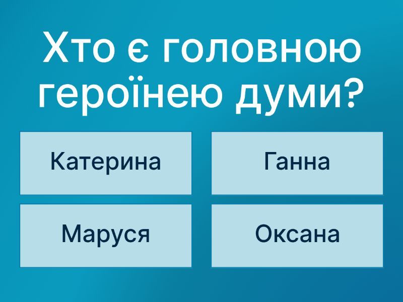 1) Хто є головною героїнею думи? a) Катерина b) Ганна c) Маруся d) Оксана 2) Де відбуваються події думи? a) В Україні b) В Туреччині c) В Росії d) В Польщі 3) Скільки років козаки були в полоні? a) 25 років b) 30 років c) 15 років d) 10 років 4) Що зробила Маруся для козаків? a) Залишила їх b) Забула їх c) Зрадила їх d) Випустила їх з неволі 5) Коли Маруся звільнила козаків? a) На Великдень b) На Різдво c) На Трійцю d) На Покрову 6) Ким був чоловік Марусі? a) Польський король b) Козацький отаман c) Український князь d) Турецький паша 7) Що є символом свободи в думі? a) Ключі b) Корабель c) Меч d) Прапор 8) Що символізує Маруся? a) Боягузтво b) Байдужість c) Сміливість d) Зраду