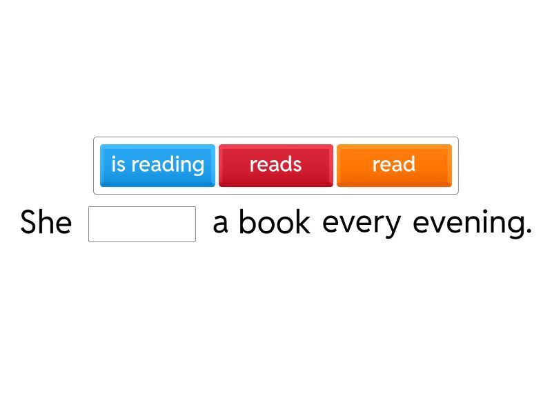She ____ a book every evening. Birds ____ in the morning. We ____ football every weekend.is playing He ____ coffee every day. They ____ English at school. are study I ____ a book right now. She ____ a letter to her friend. He ____ tea at the moment. The children ____ TV right now. It ____ heavily today.