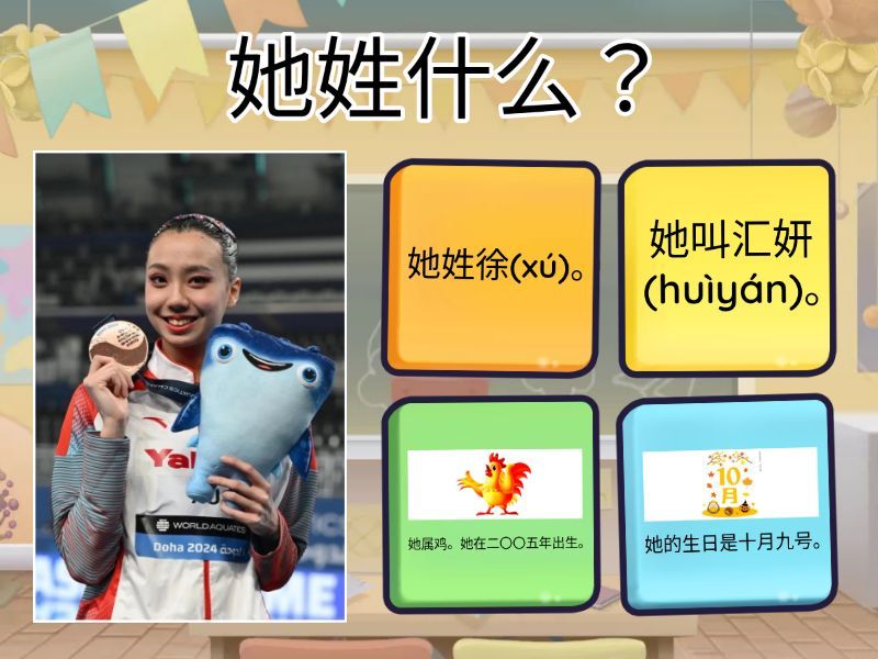 1) 她姓什么? a) 她姓徐(xú)。 b) 她叫汇妍 (huìyán)。 c) 她属鸡。她在二〇〇五年出生。 d) 她的生日是十月九号。 2) 她叫什么名字? a) 她姓徐(xú)。 b) 她属鸡。她在二〇〇五年出生。 c) 她的生日是十月九号。 d) 她叫汇妍 (huìyán)。 3) 她的生日是几月几号? a) 她叫汇妍 (huìyán)。 b) 她属鸡。她在二〇〇五年出生。 c) 她姓徐(xú)。 d) 她的生日是十月九号。 4) 她属什么? a) 她叫汇妍 (huìyán)。 b) 她属鸡。她在二〇〇五年出生。 c) 她姓徐(xú)。 d) 她的生日是十月九号。