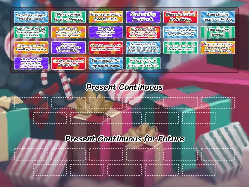Present Continuous: I’m studying for my maths exam., I’m living in a flat with my mother, father, and my dog., What are you doing? I'm hiking with my dog., I’m reading a really good book about science., She is visiting her friends., We are going paddleboarding with them., I am playing tennis., Where is Carlos? He is diving., They are returning from the USA. , Lucy is having a birthday party at the waterskiing centre., We are going to the music festival., Present Continuous for Future: I’m meeting Joe at two o’clock, and then we are zip wiring together in the park., We’re coming back on Monday., I'm hiking this weekend with my friends., We’re meeting Trisha and Eduardo for hiking and a picnic on Sunday., Karl is arriving from the horse riding competition at six o’clock., She is kite surfing with her friends tomorrow., We are going paddleboarding with them on Saturday., I am playing tennis on Friday., They are returning from a camping trip in the USA on Friday evening., Lucy is having a birthday party next Saturday., We are going to the music festival this summer.,