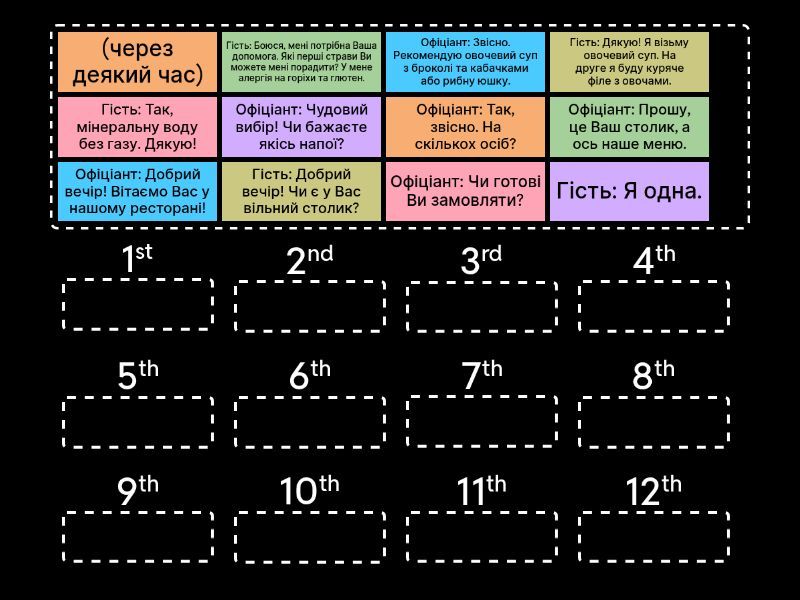 Офіціант: Добрий вечір! Вітаємо Вас у нашому ресторані!, Гість: Добрий вечір! Чи є у Вас вільний столик? , Офіціант: Так, звісно. На скількох осіб? , Гість: Я одна., Офіціант: Прошу, це Ваш столик, а ось наше меню., (через деякий час), Офіціант: Чи готові Ви замовляти?, Гість: Боюся, мені потрібна Ваша допомога. Які перші страви Ви можете мені порадити? У мене алергія на горіхи та глютен., Офіціант: Звісно. Рекомендую овочевий суп з броколі та кабачками або рибну юшку., Гість: Дякую! Я візьму овочевий суп. На друге я буду куряче філе з овочами., Офіціант: Чудовий вибір! Чи бажаєте якісь напої?, Гість: Так, мінеральну воду без газу. Дякую!.